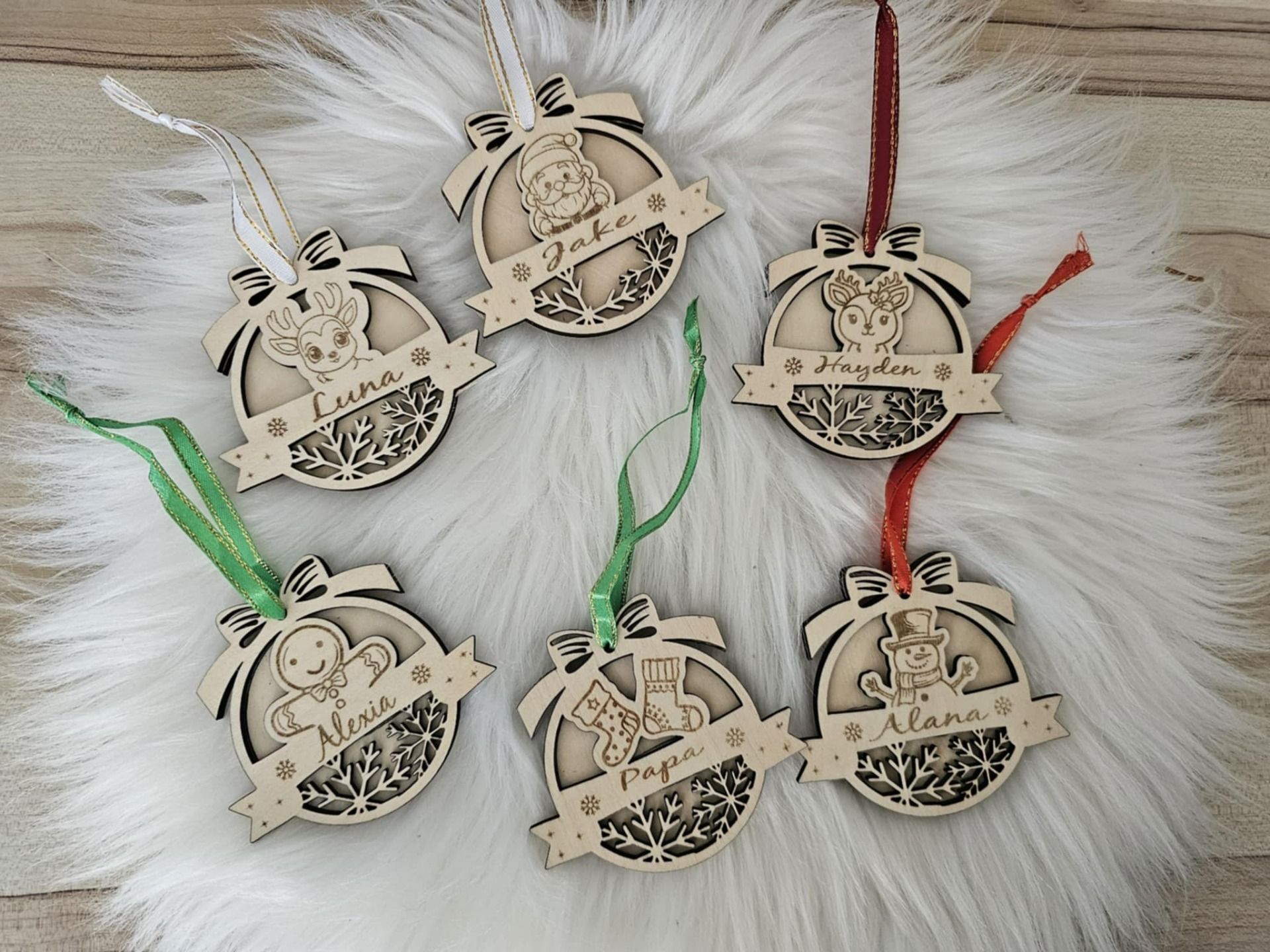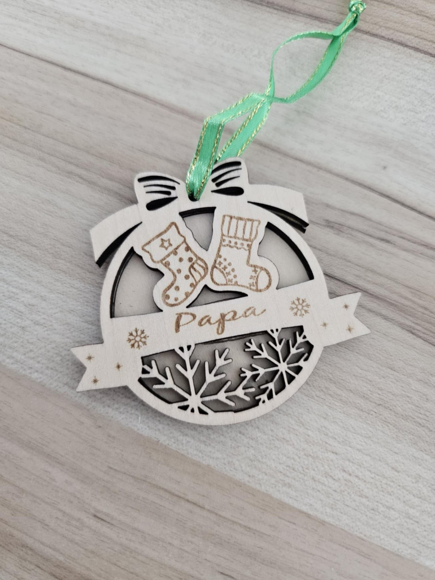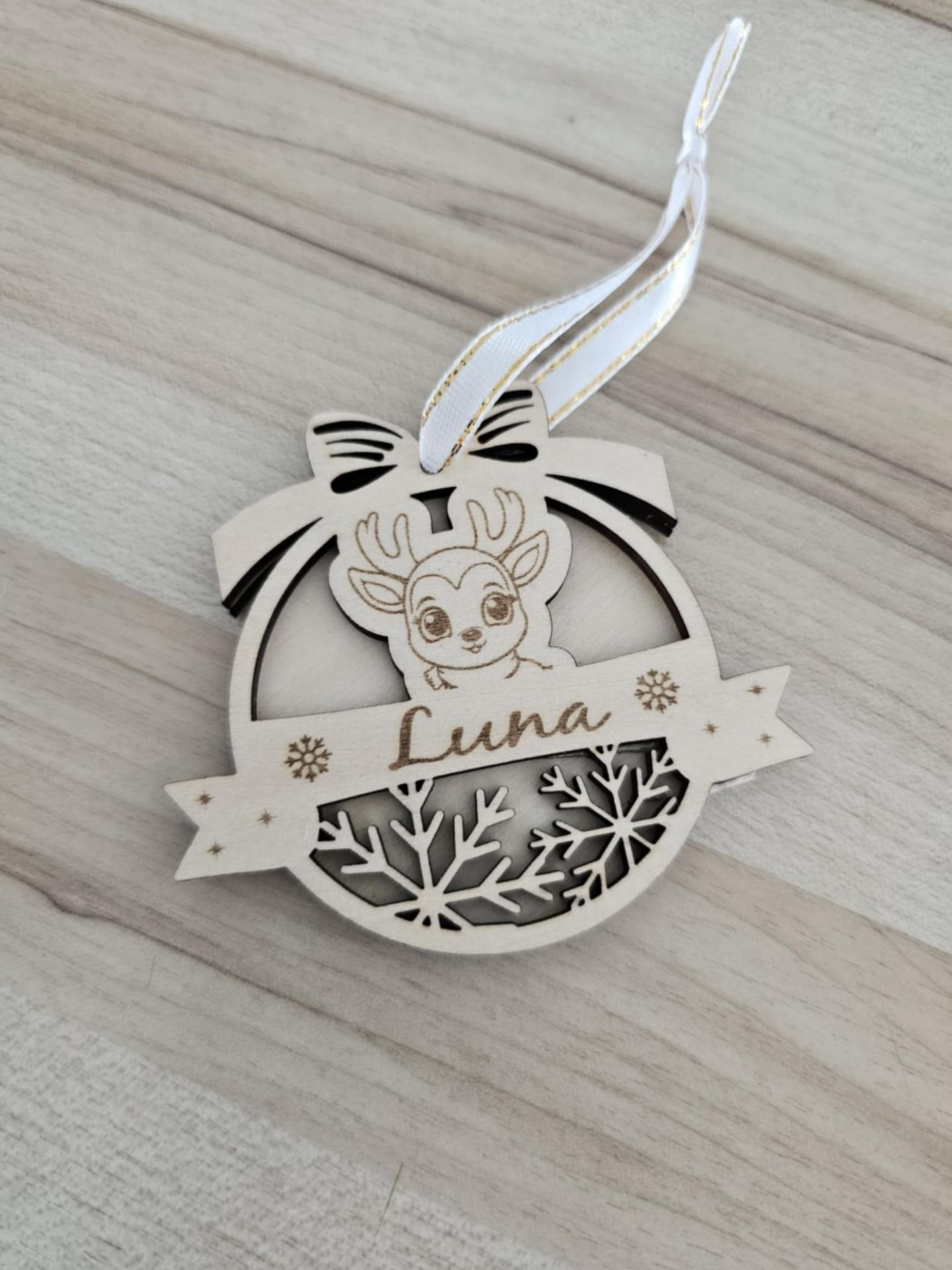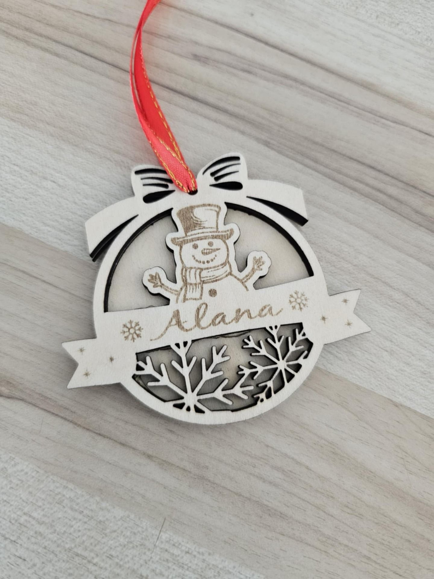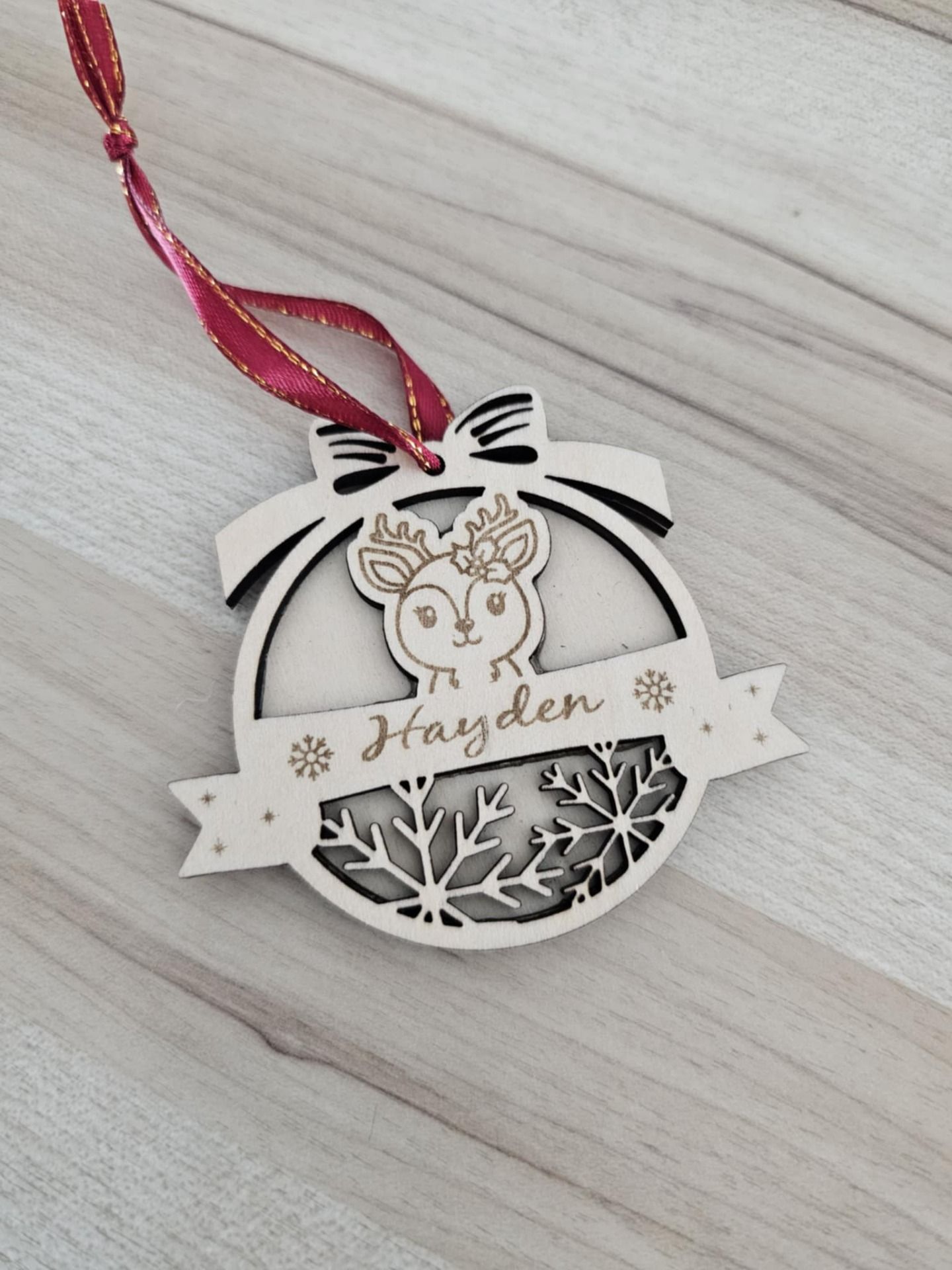 Rendez votre sapin encore plus magique avec cette jolie boule de Noël en bois gravée au laser. Chaque modèle est unique : il peut être personnalisé avec un prénom et accompagné d'un motif festif (père-noël, pain d'épices, bonhomme de neige, etc)